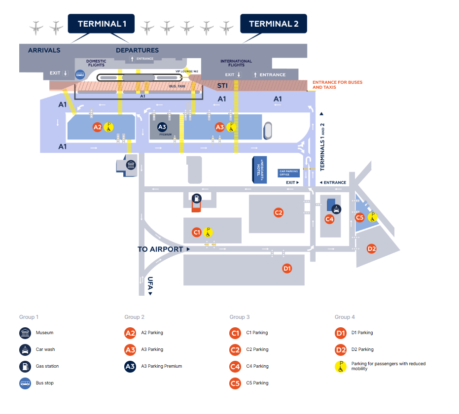 The free time in A1 area on the forecourt of the airport is 15 minutes, the entry into the area of special transport infrastructure (hereinafter referred to as STI) is intended for bus transport and taxis. In the event of entry into the STI area, it is necessary to make a payment according to the Price List for the services of the JSC ’Ufa International Area’ car parking complex. This allows to unload the territory adjacent to the airport terminals and reduce the time of arrival to the terminals.