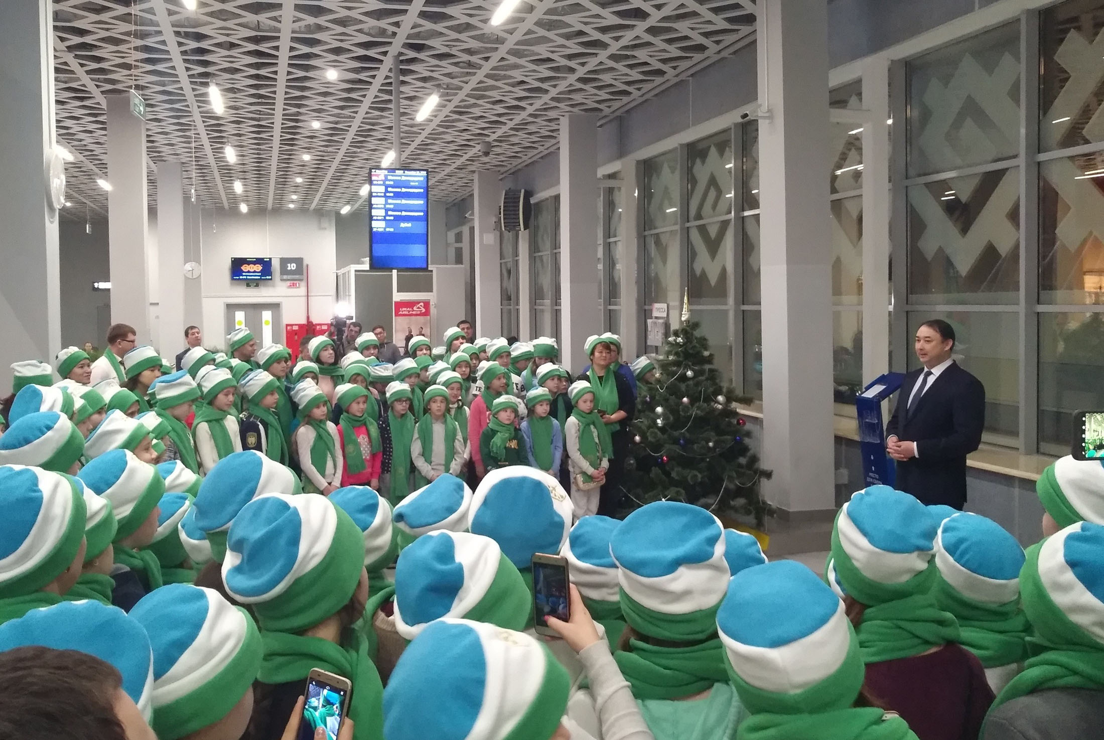 Для регистрации были выделены отдельные стойки, после чего сотрудники аэропорта проводили ребят в зал ожидания, где они могли поближе познакомиться друг с другом, пообщаться и сфотографироваться у елки.